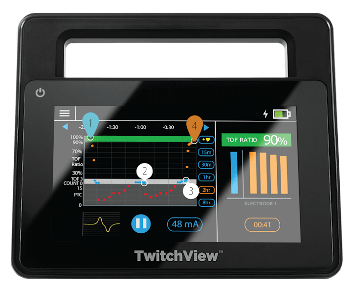 Además de las mediciones en tiempo real, TwitchView muestra el nivel de bloqueo y recuperación del paciente en un gráfico de tendencias. El gráfico de tendencias permite a los médicos visualizar cómo los agentes bloqueadores neuromusculares afectan a cada paciente de manera diferente, lo que a menudo conduce a un menor uso general de medicamentos y más opciones de reversión. Lo más importante es que la idoneidad de la reversión se confirma mediante un índice TOF > 90 % antes de la extubación, lo que elimina la posibilidad de bloqueo neuromuscular residual (RNMB) y respalda las opciones de reversión conservadoras.